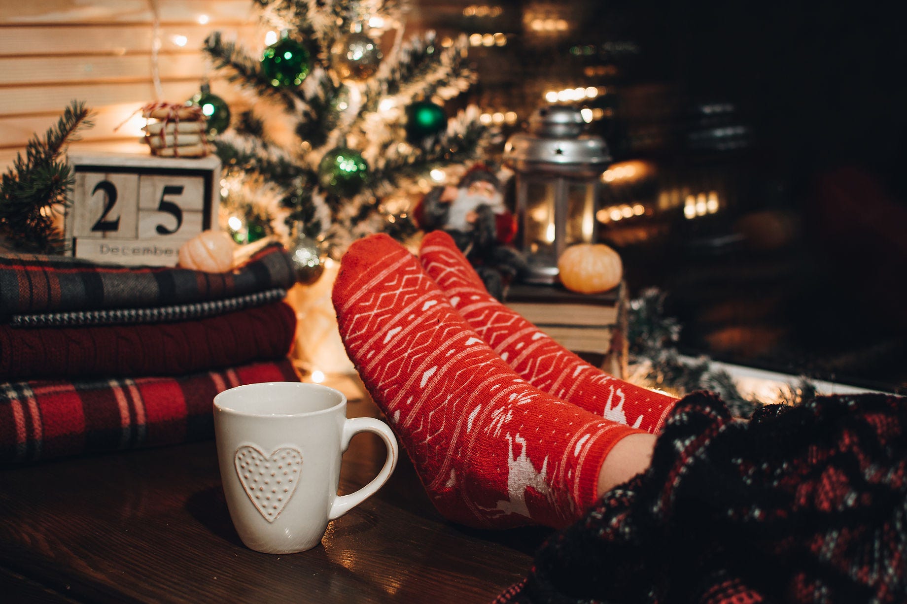Frantic figures move just beyond slippered feet propped on the cluttered coffee table.