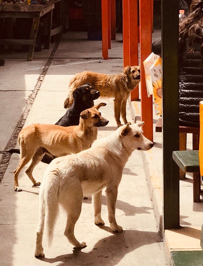 The metal cylinder bounces off dog noggins left and right. It is empty but still… it is hard to believe I was petting these fellows just minutes before as they were begging for tidbits in front of the rustic taco stand. I add my voice now, “Bad Dogs! Bad! Bad!” as if moral shaming will make a difference. The terrified woman has somehow managed to pick up her 50lb plus dog; he is huddled in her arms, giving me greater freedom in my dog thumping. All “Bad Dogs” have four feet on the ground, while the Good ( read - STUPID) Dog is elevated to some sort of safety.
