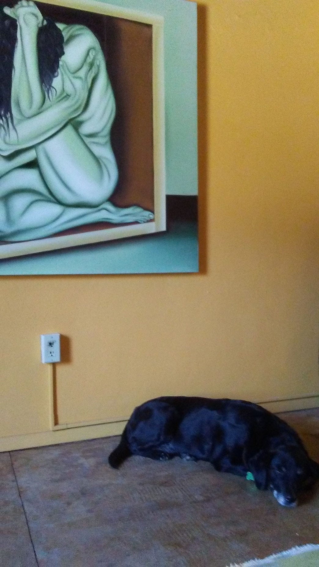 This painting was in a furnished apartment we rented when we moved to Truth or Consequences, NM. It is a well-known fact in town that the landlord buys buildings just for more wall space to display his extensive art collection. I really could have traded Girl in A Box for a puppy painting! Despite the ending of this poem, she stayed on the wall until we moved out and is probably still there. The woman who manages the property is terribly crabby though and as bad as I wanted/needed a photo to make this piece understandable, there was no way I was going to knock on her door and ask her if I could take a photo of the painting in Apartment C. Low and behold, last week Google Photos said, “Look what was happening in your life in July 2016!” and there was a long lost (except to Google - so WEIRD!) photo of the painting and my old lab Suzy. I have no idea if I was trying to take a photo of Suzy or the painting, as they are both half in and out of focus but I present to you... Girl in A Box, she still makes me cry. ):