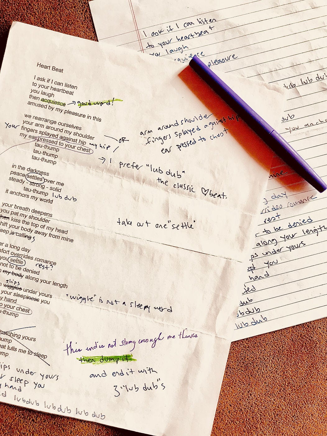 I first scribbled down the bones of this way back in... 2014, I think. I loved the experience of snuggling with Michael, hearing his heartbeat, listening to his breathing, feeling safe. Even now, we follow this little ritual almost every night. How to put it into words, though? How to take something that specific and personal and let others (hopefully) not just follow its physicality but its emotion? I sent it off to my two trusted editors and, as you can see in the photo, they had lots of suggestions. Lizzio even rewrote the whole thing out for me with all of her edits because she was afraid the arrows and circles were confusing! Most pieces don’t have this level of critique; the fact this one did, meant they really liked it (: Not all pieces require a team either but I think this one is better off for all the effort that went into it.